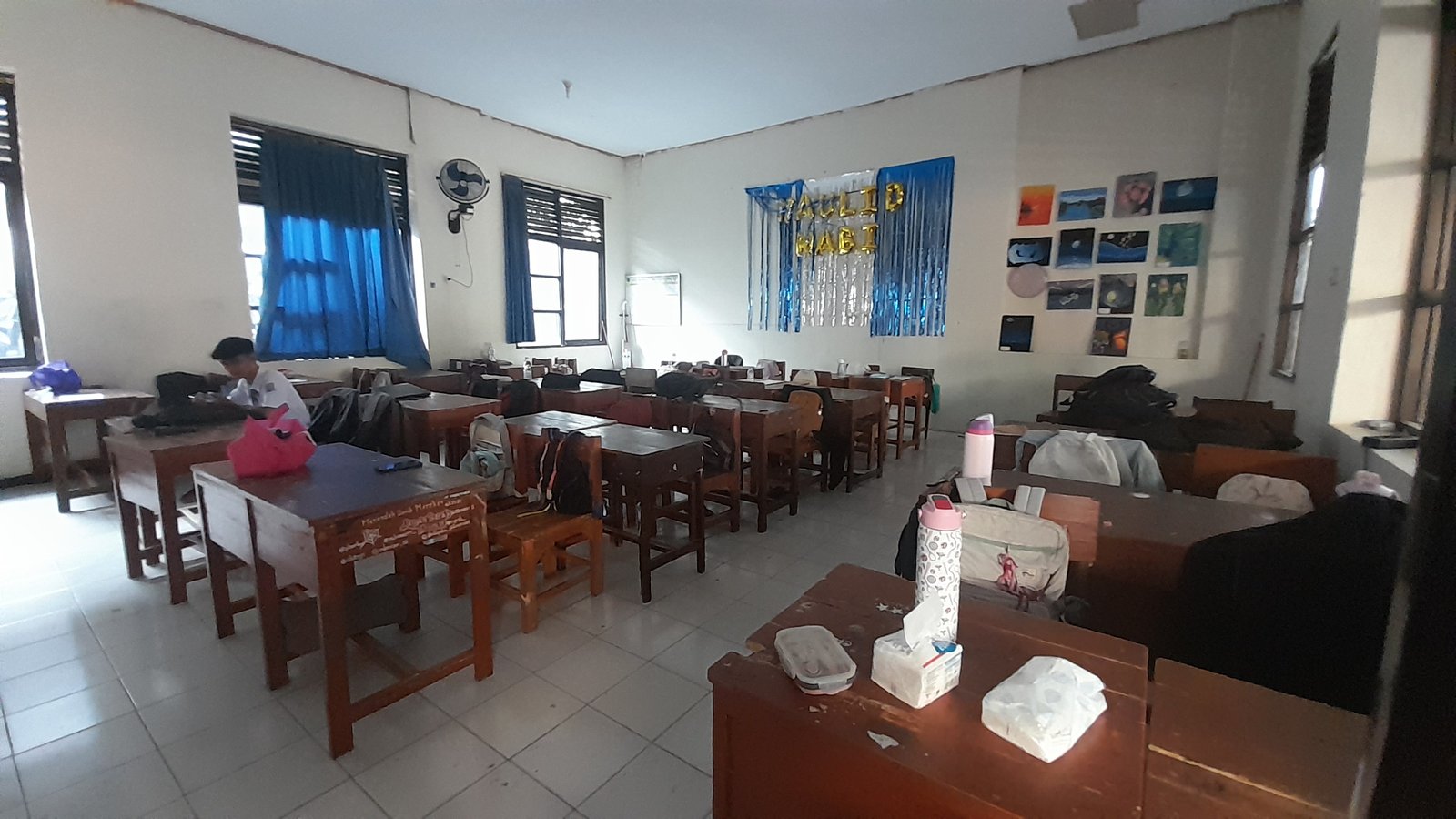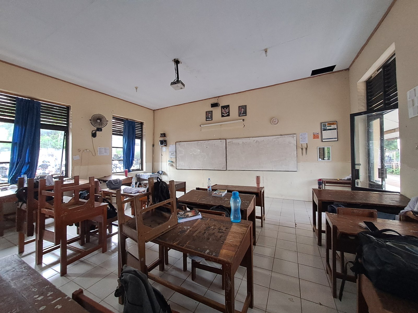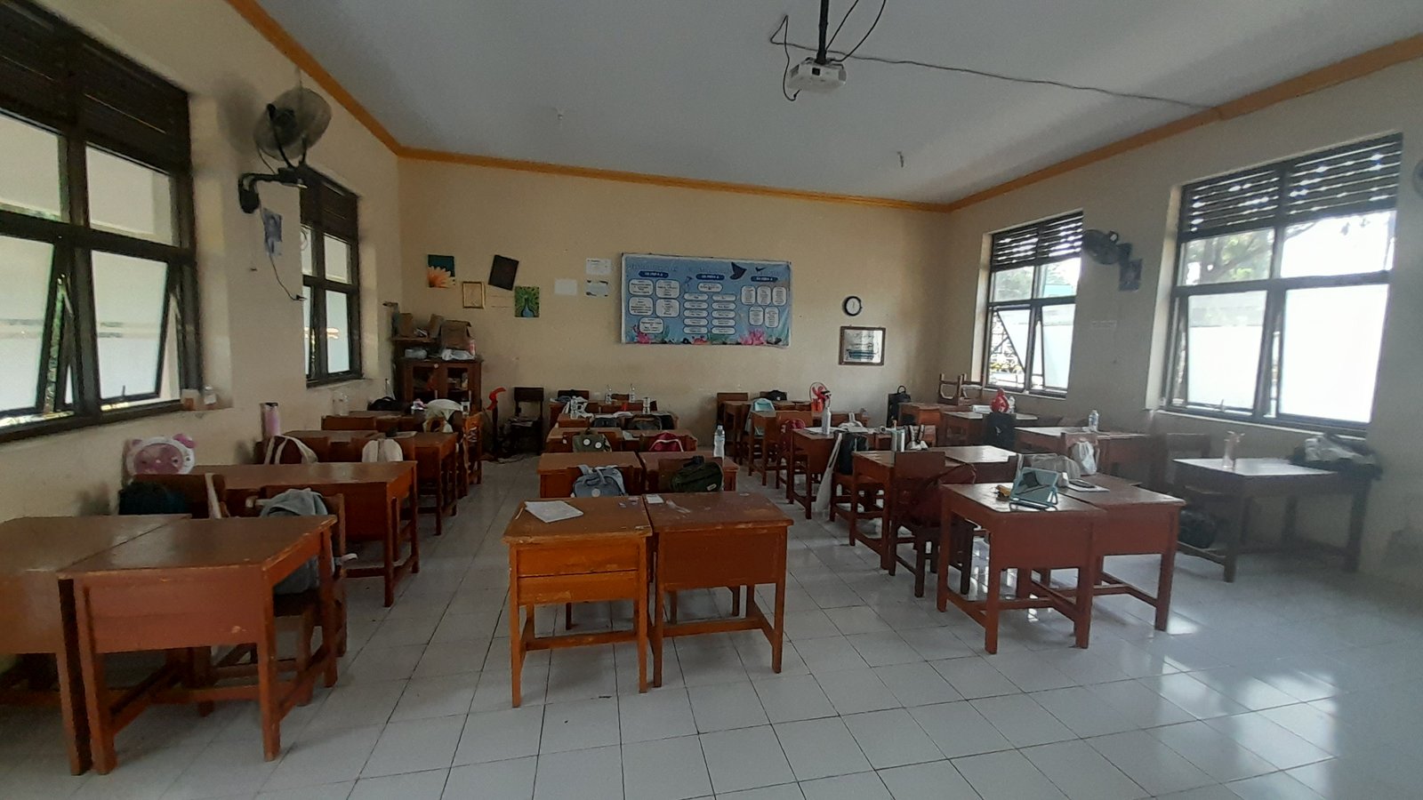 Lantai cukup bersih, kelas wangi, Meja guru rapi, Meja kursi rapi, Luar cukup bersih, Ada 5 lukisan Ada 3 foto pahlawan, Tidak ada jam